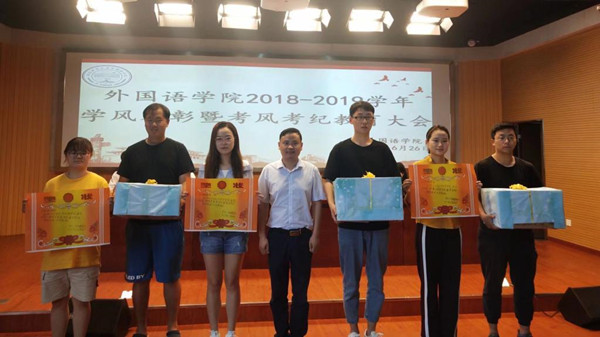 会上,学院总结了一学年来学风建设工作,对表现优秀的班级颁发了荣誉证书和奖品。学工组老师布置了外国语学院党员挂牌考试的有关工作并共同学习了《外国语学院关于进一步加强考风考纪建设的有关规定》、《77779193永利学生违纪处理相关规定摘录》。