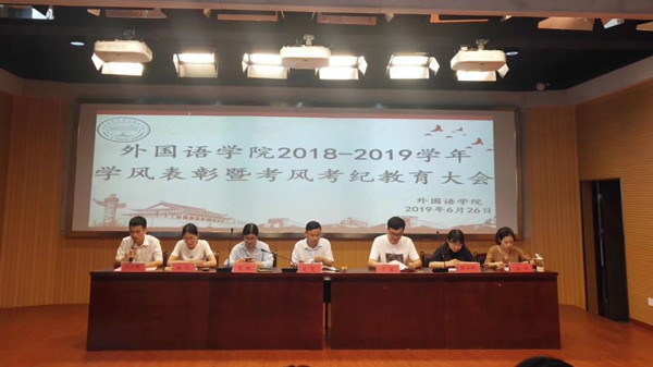 6月26日,外国语学院召开“2018-2019学年学风表彰暨考风考纪教育大会”。外国语学院党委副书记夏斐和学工组全体辅导员出席会议,2016-2018级学生干部代表、全体学生党员和学生代表参会。