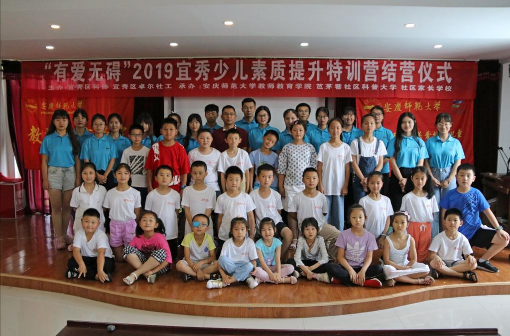 7月14日上午,经过为期七天的特训生活,“有爱无碍”2019年宜秀少儿素质提升特训营在安庆芭茅社区活动中心正式落下帷幕。宜秀区科协副主席李勇、芭茅巷社居委领导宣庆之、宜秀卓尔社工理事长王奎以及特训营的学生、家长、20名志愿者参加了此次结营仪式。