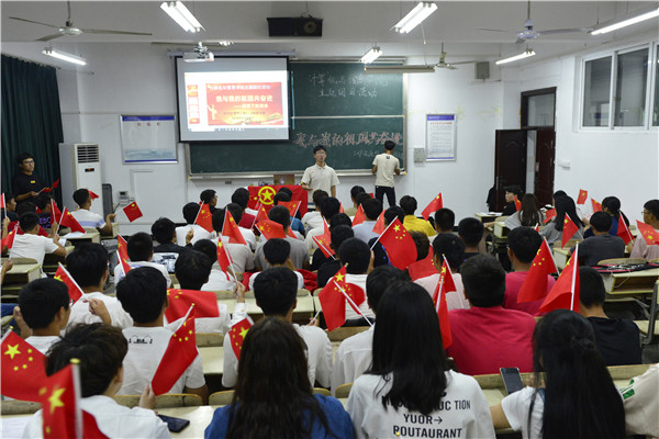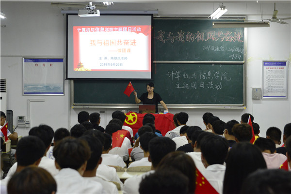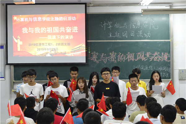 手拿国旗,共唱国歌,祝福祖国生日快乐……9月29日晚,计算机与信息学院通信工程专业2019级的两个班在文渊楼203教室举办了“我与祖国共奋进”的团日活动,近100名同学在国歌声中展现自己对祖国的祝福。