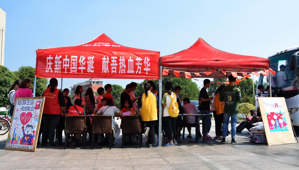 献血车到达前,大学生志愿者们已经拉开横幅,撑起帐篷,摆好桌椅,做好一切准备工作。大学生生命科学协会会长倪岭表示,“正值新中国成立70周年,举办无偿献血活动,是师大学生向祖国献上的最热忱的祝福。”