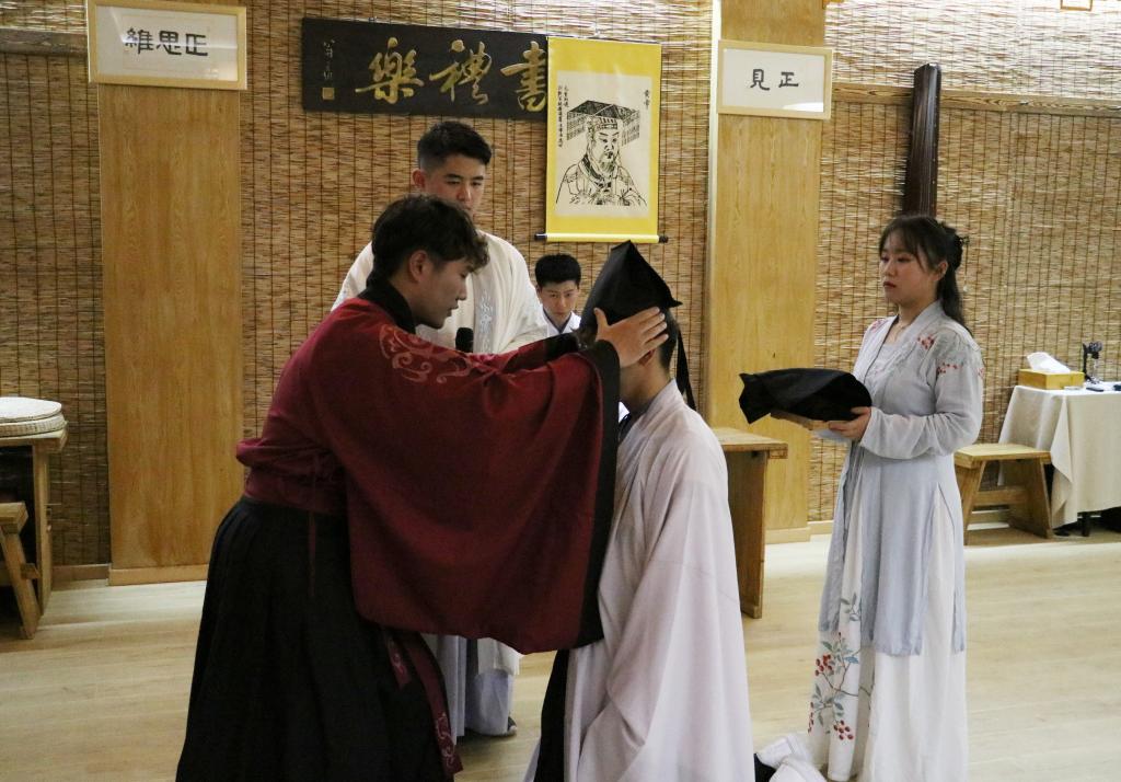穿着华丽或飘逸的襦裙,精致的发饰装点着古典的发型。近60名华夏文理汉服社的成员们成为茶馆中最引人注目的一群人。“拜,兴……”随着赞者的指令,受礼的学生向着主人、客人的方向各一拜以示尊重,再跪在蒲团上接受赞者为他们梳发、换衣、加笄、加冠。汉语言文学专业2019(1)班的艾宇龙是这次成人礼中唯一的男生,他在接受赞人的加冠和主人的聆训后正式完成了成人礼。他说:“我之前一直对这种礼仪文化很感兴趣,今天正好是我的生日,又在今天参加了成人礼,我觉得很有意义。以后也希望能像今天的学长们一样为学弟学妹们主持成人礼。”