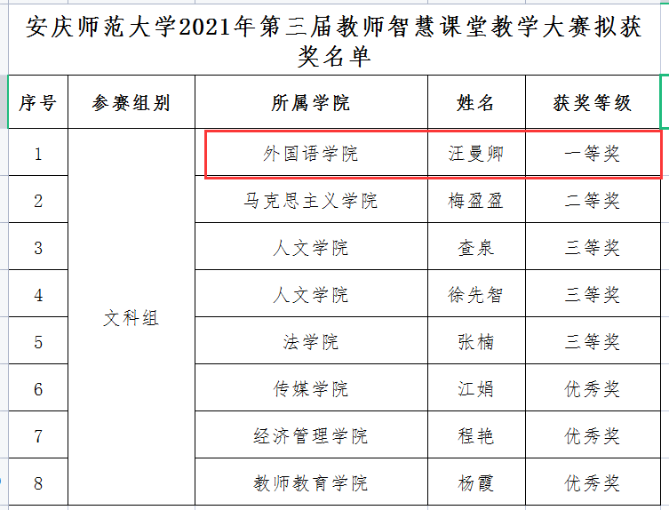 9月11日,学校第三届教师智慧课堂教学大赛在龙山校区顺利举行,外国语学院教师汪曼卿喜获文科组第一名,并将代表学校参加安徽省2021年高校教师智慧课堂教学大赛。