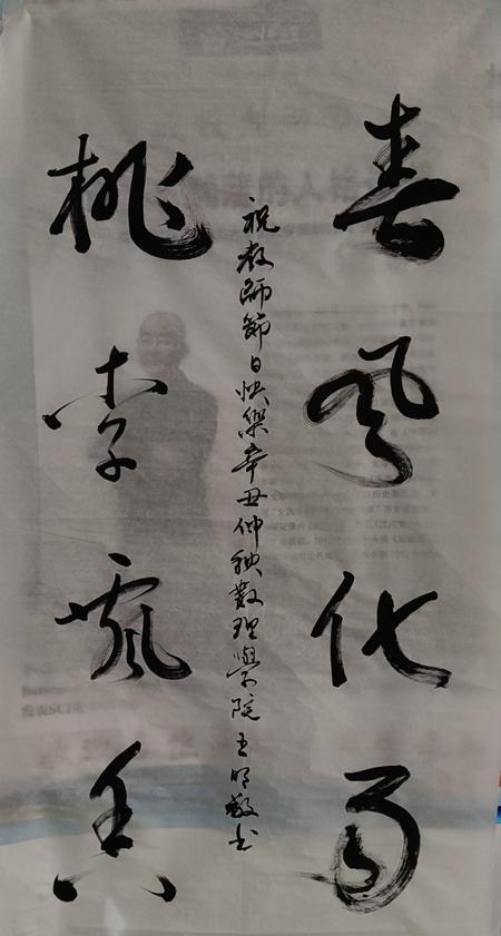 进入数理学院大厅,映入眼帘的便是一幅草书,撰写着:“春风化雨,桃李飘香”字样,书法笔力苍劲、连笔牵丝。写作者、数学与应用数学专业2019(3)班的王明自小练习书法,“书法就像我的挚友,我一直想用它为老师送上祝福。”谈到教师,王明表示自己对这个职业充满了向往,他非常感激无私帮助他的老师,“以后我也要成为一名受到众多学生喜爱的老师。”他说。