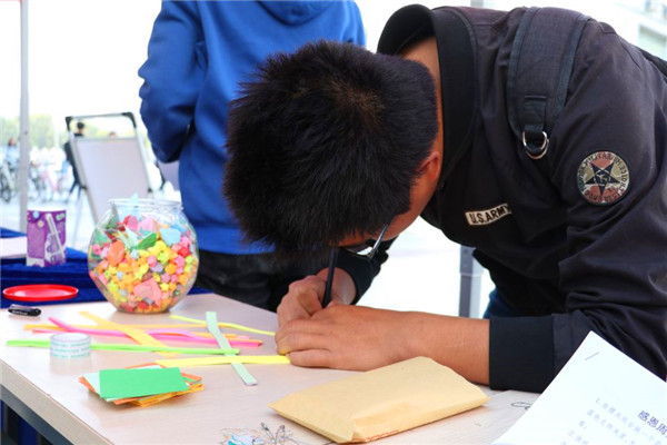 11月21日上午8点,工作人员便开始为线下摆点活动做准备。桌面上仔细地摆好了信纸、明信片、书签、折纸等道具,帐篷两旁还用纸鹤做成帘子形状作为装饰。刚搭好帐篷,就有不少学生来了解参与。有的学生给室友写了一封感恩的信,有的学生则专心折着纸鹤,还有的学生拿出手机与玩偶合影,现场气氛热烈,帐篷前甚至排起了长队。