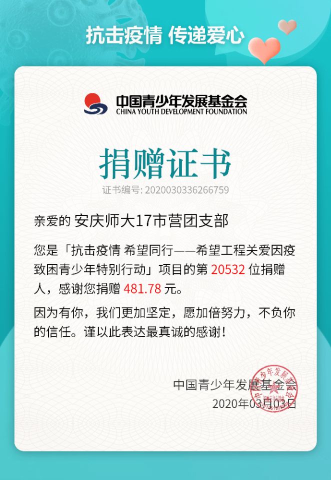这次成为一名防疫志愿者,也是程波一直以来的心愿,她一直希望能够通过自己的努力为大家做服务。除了在线下成为一名志愿者之外,作为班级班长,她还联系了班级团支书和其他班委们,以团支部的名义向中国青少年发展基金会,为因疫致困的孩子们募捐了481.78元善款。“作为一名青年团员和大学生,我觉得更要有所担当和作为,这些孩子和我一样,他们现在遇到了困难,但这是暂时的,我相信在大家的关爱下,他们一定能克服困难,我也要将爱心的接力棒传递下去。”(学生记者 应超)