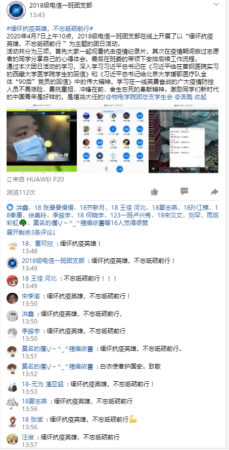 在云端团日活动中,团员代表围绕新冠肺炎疫情防控为主题,与支部团员青年分享打动自己的英烈故事,支部团员也开展了线上交流讨论。电子信息科学与工程2018级张曼说:“感谢为我们负重前行的每一位英烈,我想我们不仅要致敬他们,更要以他们为榜样,肩负起我们的使命。”光电信息科学与工程2017级王钰锋说:“无论是疫情一线的医生,还是牺牲火海的战士,都是我们学习的榜样。今后我也要用我自己的专业知识,向社会贡献一份力量。”