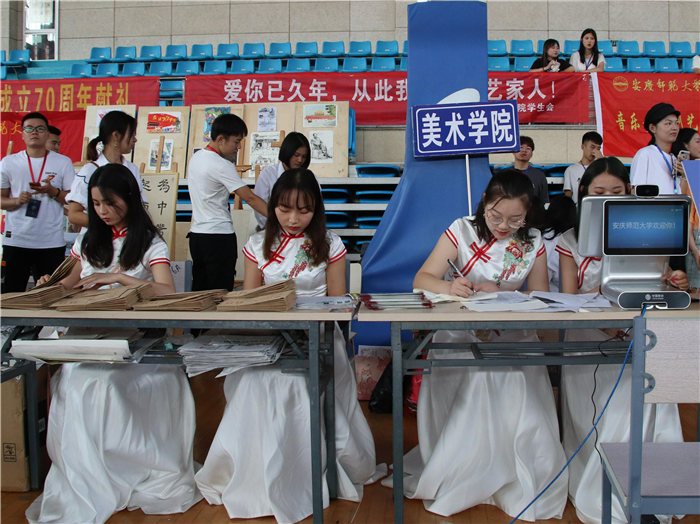淡雅的白色旗袍,上面是红色的花瓣与绿色的花茎,领口、袖口与裙摆处锁着精致的红边。四位穿着旗袍的迎新人员在美术学院报到点为新生办理报到工作。