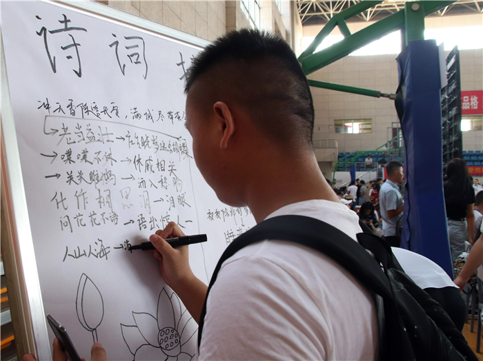 谈及设置这个游戏的原因,信息与计算科学专业2017(1)班朱刘欢说:“我们就是想让新生能快点融入大学生活,虽然我们院都是理科,但文学的学习也不能减少,希望大家通过四年的学习能够文理兼修,文理双全。”他表示,除了这个游戏外,他们还设置了数学情话等其他不同类型的游戏,以此来活跃迎新气氛。