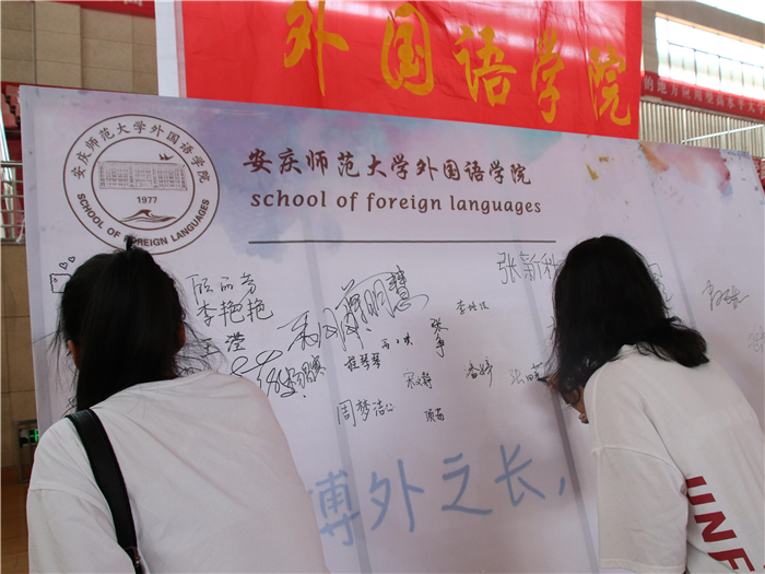 签名墙的设计既蕴含外国语学院的特色,又满怀对新生的祝福。师范英语专业2019(2)班的项茹说:“签名墙很好看,学长学姐们很耐心地指导我们报名,这些都让我感到很亲切,也很感动。”