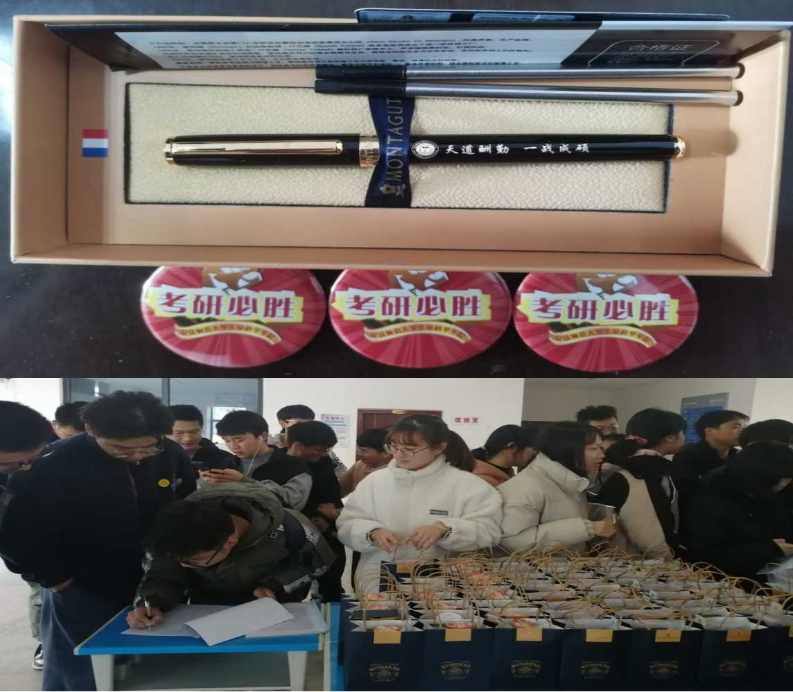 会议结束后,考研学子们于学院大厅领取考研慰问礼品,在礼品袋中有定制的考试文具与一枚“考研必胜”的徽章,表达了学院对考研学子的美好祝愿。生物技术2018(2)班的汪妍在拿到礼品后表示:“学院简直太贴心了!”在慰问会前,汪妍面对紧张的备考产生了焦虑心理,但是在听完学院教师的经验分享后,她又重新调整心态,积极面对考试。