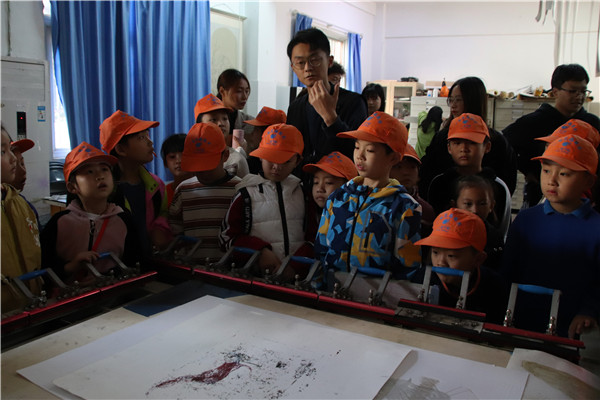 “大家现在看到的是我们的台式曝光机,是我们版画创作工具的一种。”在版画工作室里,版画专业2017级的王晋南正在向学生们介绍版画工具,孩子们争先恐后地走到机器前面观看,不时地发出一些称赞和惊叹。