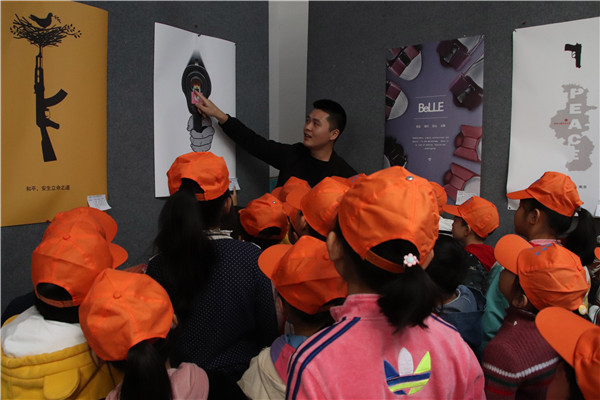 “小朋友们,你们听说过螳臂当车的故事吗?”“我知道”“我也知道,就是自不量力”……视觉传达设计专业2017(1)的王梦宇站在一幅绘画作品前,向小学生们讲解,他指着画说:“枪代表战争,车轮代表和平,和螳臂当车一样,战争阻碍我们和平的车轮也是自不量力的。”
