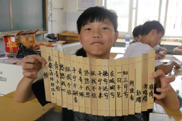 为了让同学们更深切地体会到中华文化的魅力,志愿者们还带大家共同制作了我国古代用来记录文字的竹简。同学们将一根根竹片仔细的用绳子串联好,用笔在上面写下自己的心里话。许多同学在竹简上写下自己的小愿望,也有同学在竹简下写下自己对父母的祝福与思念。“希望家人平安健康,友谊地久天长。”“希望爸爸妈妈多在家陪陪我。”……