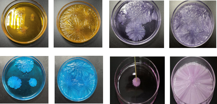 讲解结束,进入动手体验环节。同学们四五人一组,按照步骤配置“神奇”溶液,最后牙签沾点醋酸钠轻轻一点,瞬间结出五彩的绚丽冰花。“今天亲眼目睹了热冰实验,简直超出我的想象,太神奇了!”2020级化学工程与工艺(2)班的范宇翔说。