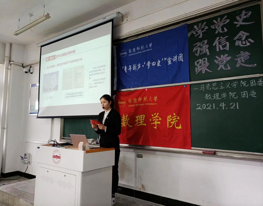 4月21日下午,马克思主义学院“青年新声‘学四史’”宣讲团与数理学院联合开展“扬青年之声•颂百年华诞”青少年党史学习教育宣讲活动,以“中国共产党为什么能”为主题,带领同学们重温革命历史,歌颂中国共产党。