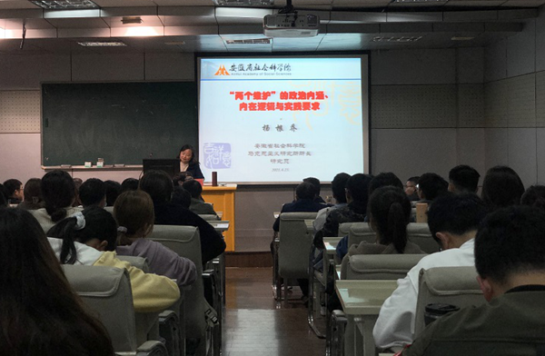 杨根乔从世界政党发展史、中国共产党百年史、党的十八大以来党的建设情况以及习近平同志为核心的党中央的战略安排四个方面阐述了“两个维护”在中国共产党百年历史重要性;从内涵、结构、关系和主体四个方面解析了“两个维护”的政治内涵;从理论、历史和现实三个方面分析了“两个维护”的内在逻辑。她指出,“两个维护”是具体的,既是政治标准,也是实践标准,践行“两个维护”要体现在坚决贯彻党中央决策部署上,体现在履职尽责做好本职工作的实效上,体现在广大党员干部日常的言行上,要从筑牢“两个维护”的思想根基、抓好“两个维护”的示范引领、完善“两个维护”的体制机制三个方面准确把握“两个维护”的实践要求。