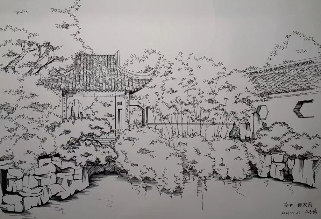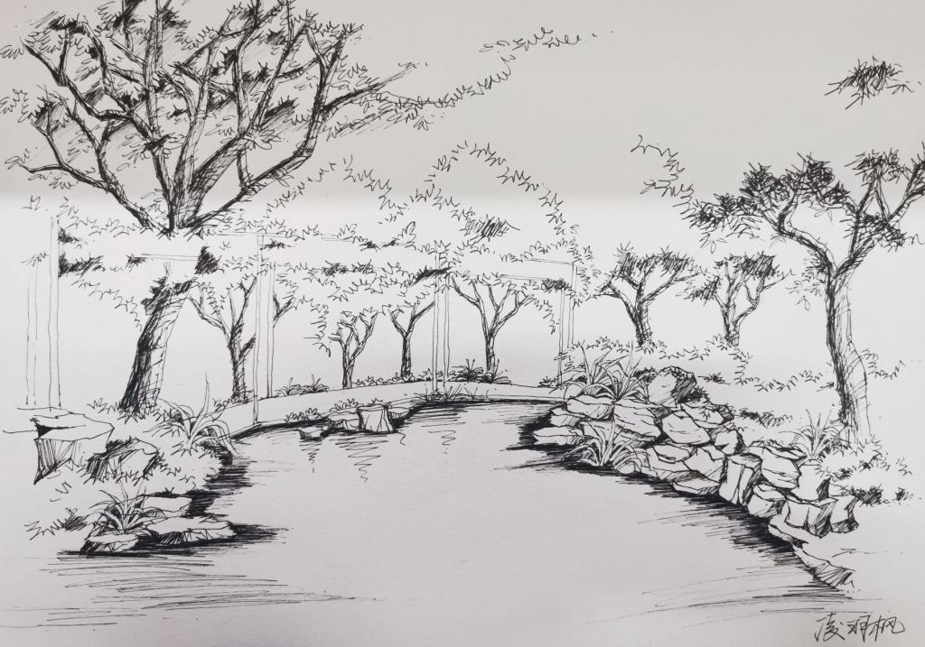 在该院教师的指导下,该院学生掌握了一些描绘假山,水池,树木,亭廊的方法,同学们对实景的描绘能力、对线条的控制能力、对明暗灰度的划分能力都获得很大提高,通过现场教学和绘画练习,不少同学作品,整个空间感层次明显,群落配置适宜,透视效果好。
