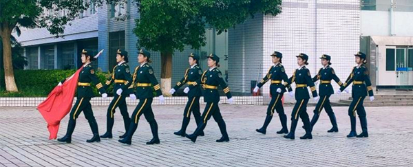 在注目礼下,英姿飒爽的国旗护卫队队员们护送鲜艳的五星红旗向国旗台走来。