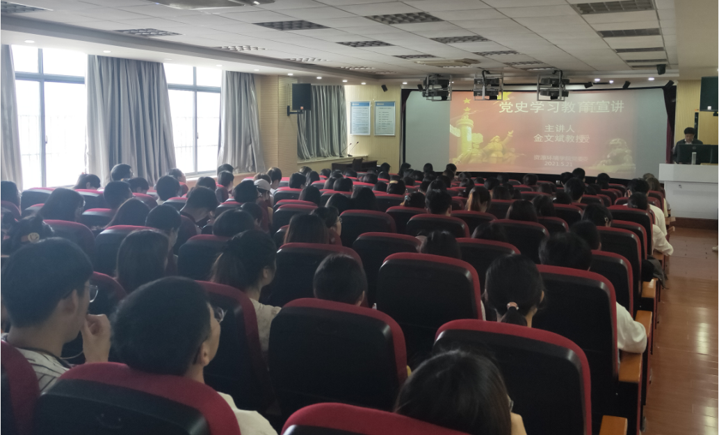 为贯彻落实学校党委关于党史学习教育的部署要求,全面提升学生党员的政治素养,教育引导学生党员做到学史明理、学史增信、学史崇德、学史力行,5月21日,资源环境学院党委在报告厅开展党史学习教育,邀请校马克思主义学院党委书记金文斌教授为学院全体学生党员做了一场“从中国共产党历史谈初心和使命”专题宣讲。院党委书记夏宏宇、党委副书记刘燕杰、各学生党支部书记及全体学生党员共同聆听了本次宣讲。