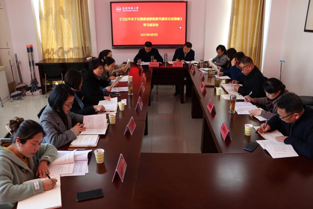 4月9日,教师教育学院组织安庆家庭教育研究指导中心部分研究人员召开《习近平关于注重家庭家教家风建设论述摘编》学习座谈会,安庆市妇联主席焦玲、副主席张莉、永利官网“女生工作坊”负责人陈银凤应邀出席会议。安庆教育研究指导中心理事会成员和学术委员会委员参加会议,会议还邀请了安庆市委党校、安庆市家庭教育讲师团部分教师参加会议。