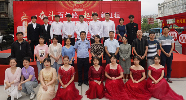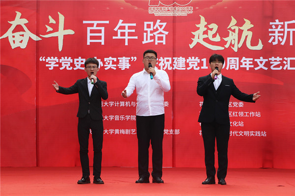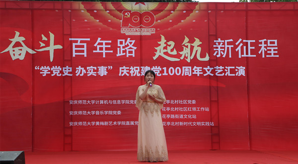 婉转悠扬的竹笛独奏、明快的黄梅戏联唱、饱含深情气势磅礴的红色歌曲的合唱或独唱……。6月19日,安庆市花亭北村社居委广场热闹非凡,由永利官网计算机与信息学院、音乐学院与黄梅剧艺术学院师生组成的文化惠民志愿服务队开展的“学党史 办实事”庆祝建党100周年文艺汇演正在此进行。计算机与信息学院党委书记陈银凤、音乐学院党委副书记肖之进及永利官网师生志愿者与社区干部群众百余人共同观看了此次演出。
