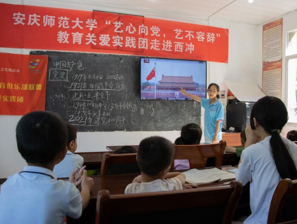 7月15日,大学生艺术教育俱乐部联盟组建的“艺心向党 艺不容辞”教育关爱实践团,为太湖县天华镇西冲村留守儿童开展党史学习教育,引导童心向党,为学习百年党史、传承红色基因搭建桥梁。