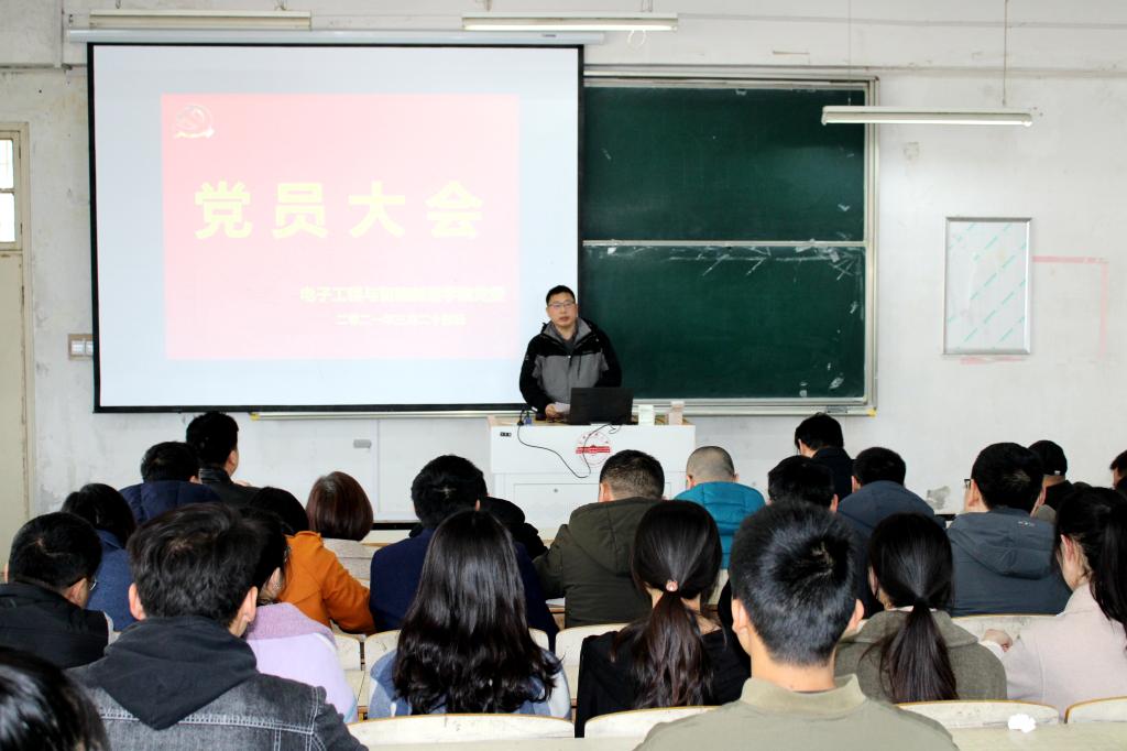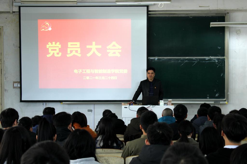 3月24日下午,电子工程与智能制造学院党委在稼先楼二楼多媒体教室召开全体党员大会,深入学习贯彻习近平总书记在党史学习教育动员大会上的重要讲话精神,传达学习省委和校党委党史学习教育暨新一轮深化“三个以案”警示教育动员部署会议精神,对学院党史学习教育暨开展新一轮深化“三个以案”警示教育进行部署安排。学院党委书记江贵生作动员讲话,会议由学院党委副书记关德军主持。