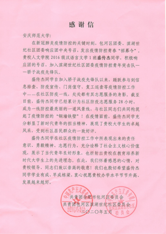 “盛传杰主动加入社区战役先锋队,在工作中展示了当代青年良好形象,也折射出贵校培养新时代大学生的先进教育理念……”6月15日,人文学院团委收到一封来自合肥市包河区滨湖世纪社区服务中心的感谢信。信中介绍了盛传杰同学的抗疫事迹,称赞他的责任与担当,肯定人文学院的人才培养理念,字里行间流露出真挚的感谢。不止盛传杰,在人文学院团委的积极号召下,疫情期间还有许多有担当的青年志愿者涌现,他们用行动向社会展现了安庆师大学生的风采。