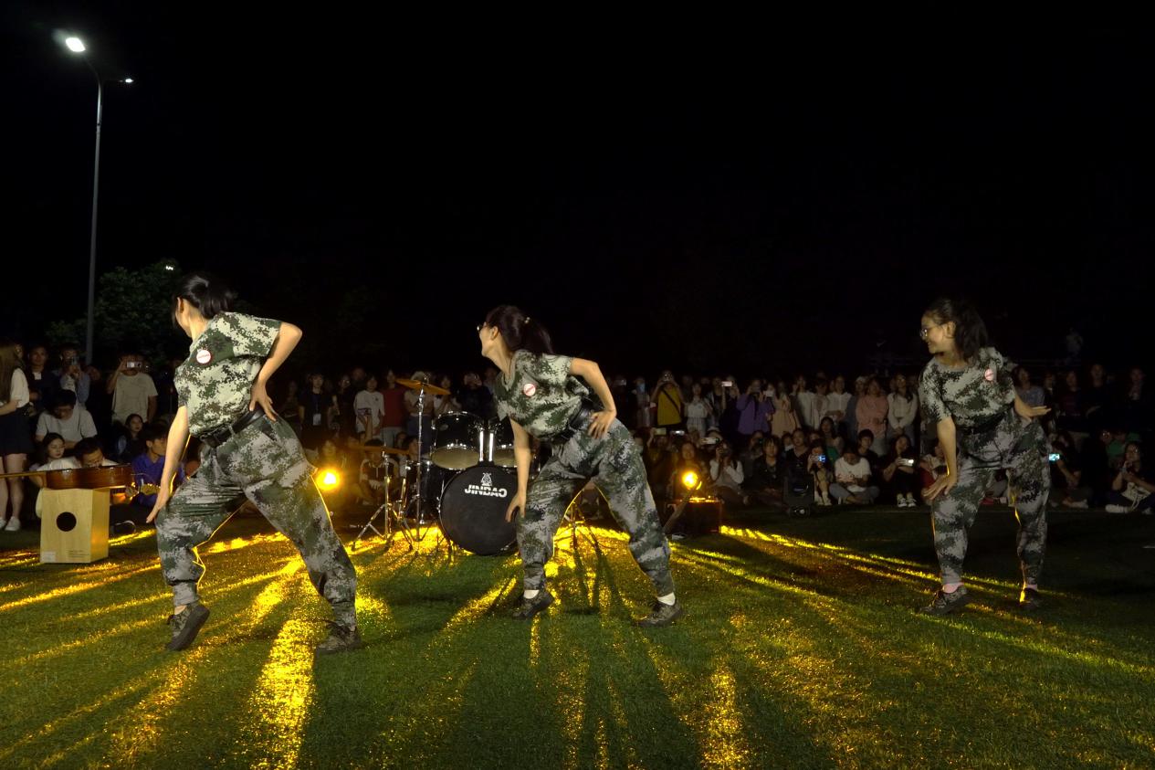 除了各个乐队的热情献唱,现场还有体育舞蹈专业学生带来的舞蹈表演。节奏感强烈的音乐加上流畅有力的舞蹈动作,让现场观众得到了视觉和听觉的双重享受。“我本来在排练院里合唱比赛的曲目,但一直听到这边的歌声和欢呼声,排练结束我就马上过来了。”运动康复学专业2020级的郑海燕来得比较晚,她站在最外圈踮着脚,举着手机想拍到里面的表演画面。“果然现场听的感觉更好,这就是我想象中的大学生活。”她兴奋地说。