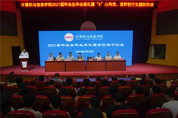 “畅想青春的旋律,把握无悔的明天。”6月28日晚,计算机与信息学院2021届毕业生毕业典礼暨“e”心向党,逐梦前行主题联欢晚会在图书馆东厅举行。学院全体领导、教师代表、毕业班辅导员和毕业生等400余人参加典礼,典礼由党委副书记江晋剑主持。