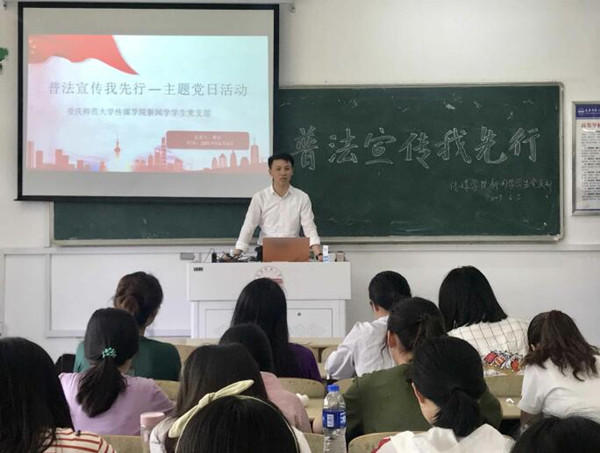6月5日,传媒学院新闻学学生党支部在文渊楼101教室开展“普法宣传我先行”主题党日活动,新闻学学生党支部全体成员参加。活动由新闻学学生支部负责老师主持。