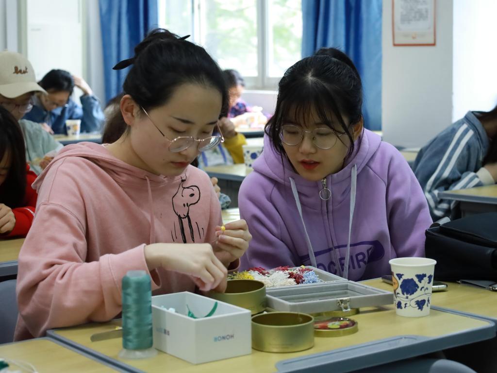 铜线穿珠、花片随后、固定竹体……汉语言文学专业2020级(2)班的学生吴晓作为指导人,首先向大家演示了制作发簪的最简步骤。学生们被她吸引,纷纷围在她身边观察学习、互相讨论,商量着自己的发簪制作想法,参与热情高涨。