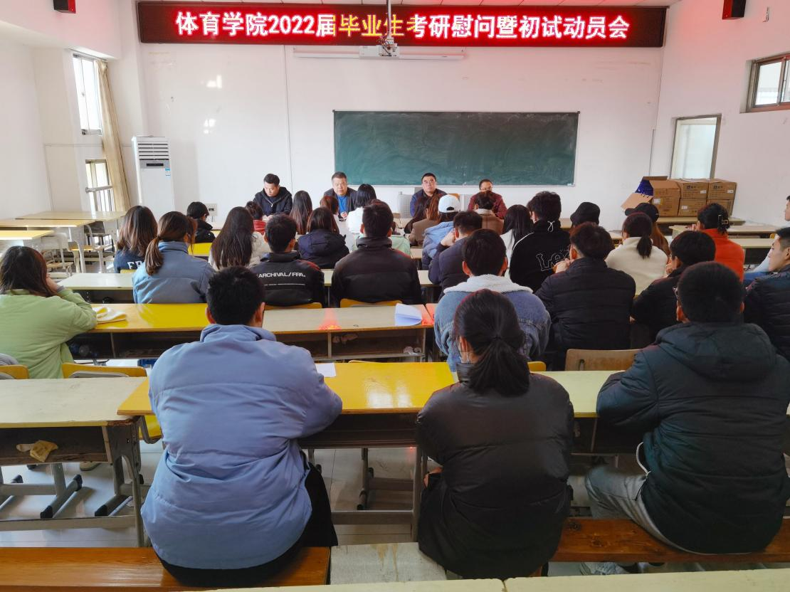 12月3日,体育学院在学院多媒体教室召开2022届毕业生考研慰问暨初试动员会。体育学院领导班子成员、辅导员和2022届考研学生参加了慰问会,会议由学院党委副书记高栋梁主持。