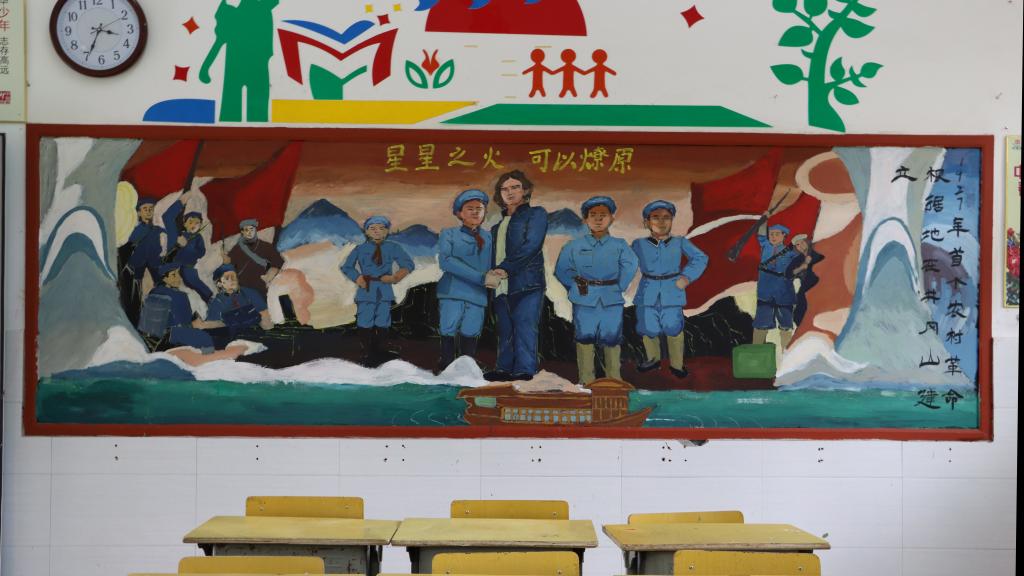 一叶红船,从历史深处驶来,激荡着中国百年历史变化。每一幅板报的底部都绘上了嘉兴的红船,通过红船一次次的游历,讲述了党发展的23个大事记。“这个创意是来自于新华社的短视频:送你一张船票,我们从视频中得到灵感,想通过这种轻松的方式,让小学生们更好的了解党史。”美术学院老师文雯介绍说。