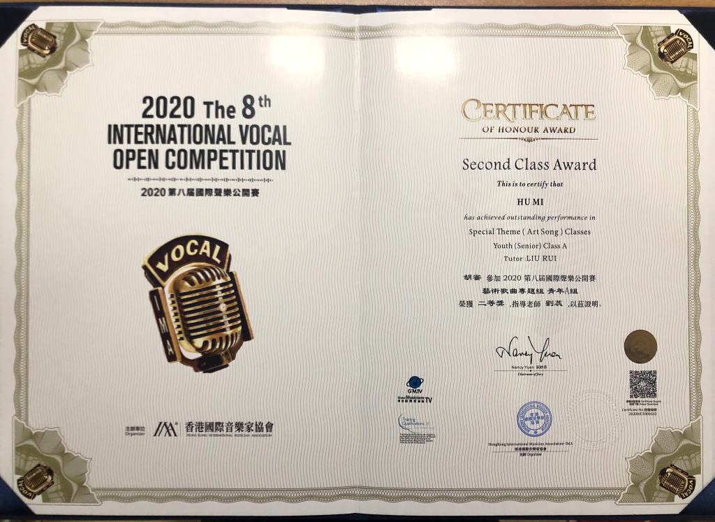 日前,第八届国际声乐比赛总决赛在珠海成功举行,音乐学院音乐学专业2018级(4)班学生胡蜜凭借着出色的现场表现最终在总决赛上获得了青年A组“二等奖”。