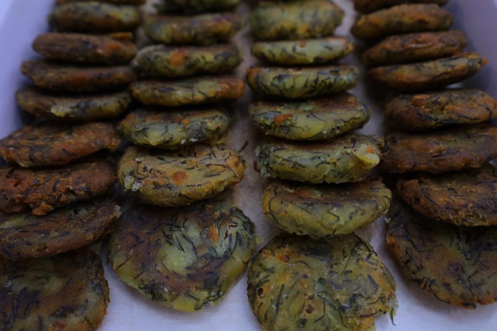 清洗野菜、加入米面、揉捏面团、挤压成饼……在食堂中,学生们将“满满当当”的野菜放入盆中进行加工,制作成蒿子粑和小蒜粑。生物科学专业2020(2)班的周发在制作蒿子粑粑时摆出“行家气势”,一手扶盆打圈、一手翻揉面团向在场学生进行制作演示。