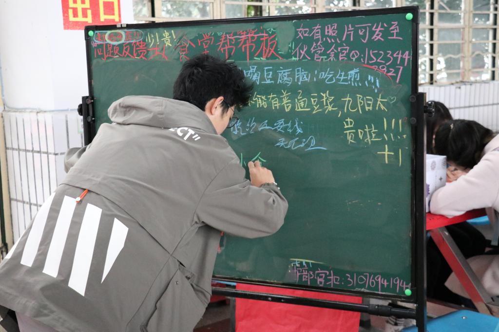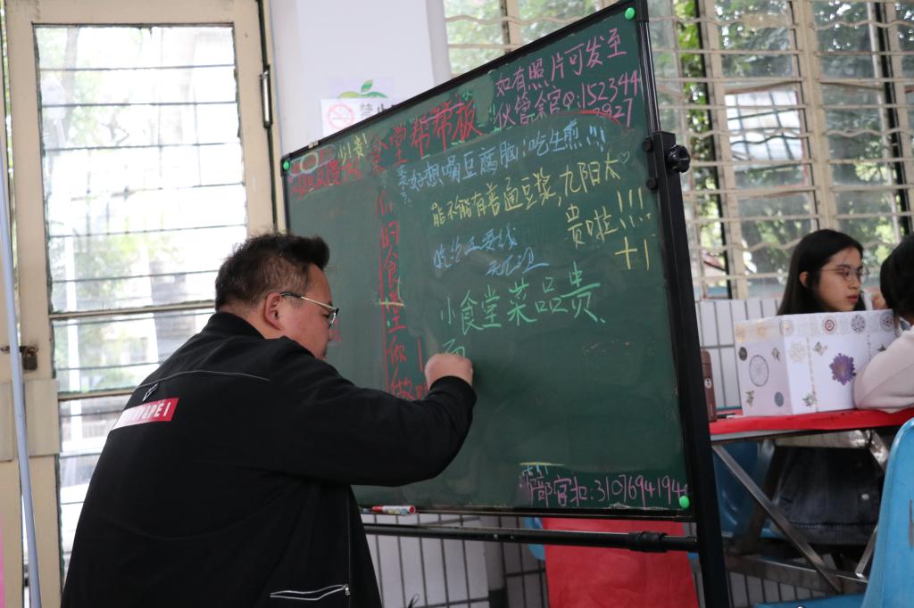 “新校区的伙管会很积极地和我们这边洽谈‘帮帮板’的事情,学生们的反响和支持声也很强烈。”周平表示,目前来看,黑板上每天都被同学们用各种颜色的粉笔写满问题,其中反馈较多的就是菜品过于单一和饭菜质量不高以及排队时间过长等问题。“我们都会尽全力去解决同学们反馈较为合理的问题,尊重每位学生的意见,让就餐体验变得更好。”