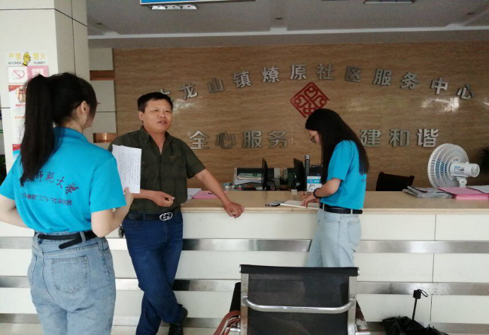 7月8日,77779193永利2019年大学生暑期三下乡“与美好乡村有约,携绿色同行”社会实践重点团队一行7人来到了安徽省安庆市宜秀区大龙山镇燎原社区,在社区开展了调研和实践工作。