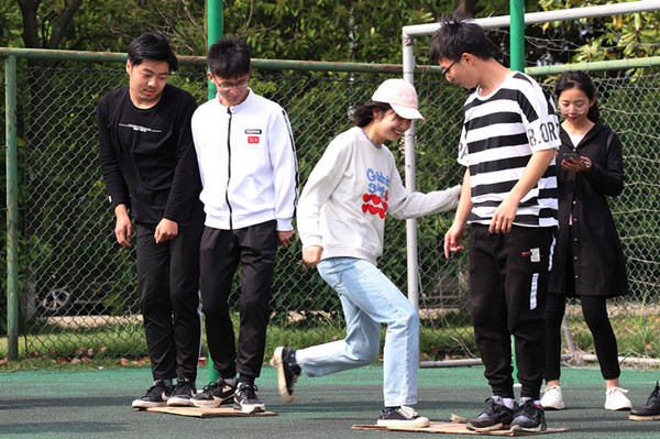 纸板传情这个项目要求队伍中4名成员在规定的时间内,通过踩在纸板上并且不断传递纸板到达终点。“因为纸板面积有限,所以这个项目考验队员之间的团结协作能力。”小学教育2017(3)班陈薇说,“我感觉这是一个非常有意义的项目,可以提升室友之间的感情。”