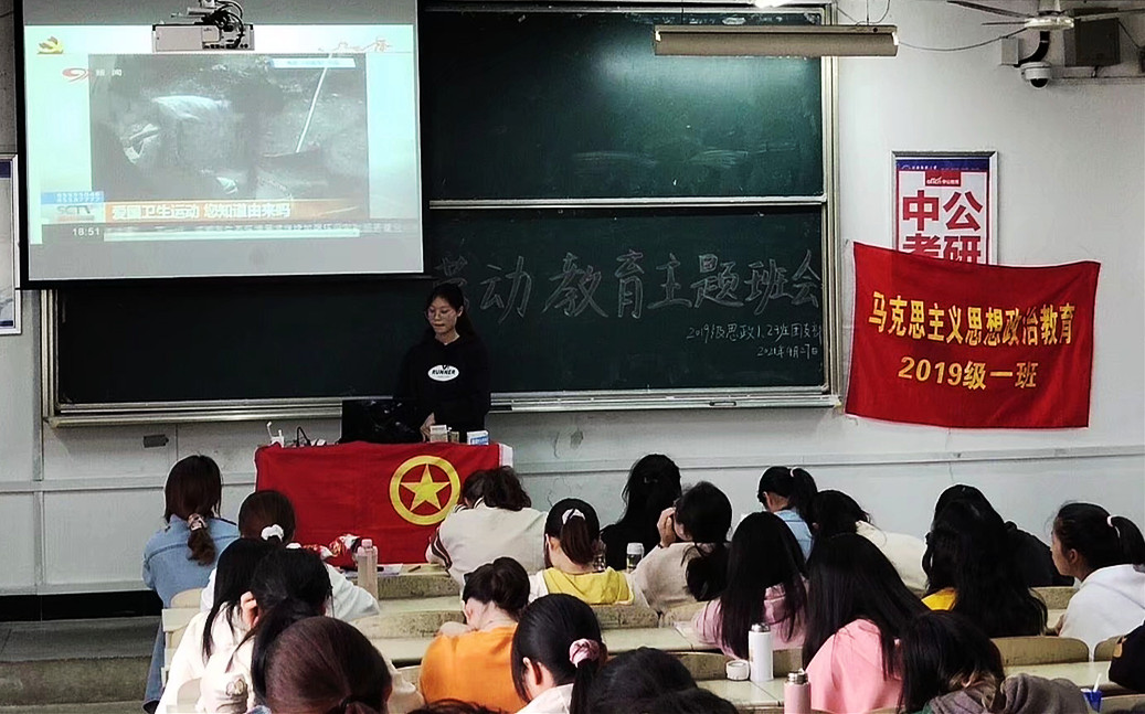 宣传爱国卫生运动的发展历程与显著成效,普及疾病防控的重大意义,播放劳动榜样人物的宣传视频,思想政治教育专业2018级(1)班还引导同学们讨论爱国主义和集体主义教育相结合的重要性。“班会课上分享的劳动榜样只是大家熟知的,有代表性的,但其实劳动的榜样就在我们身边,我们自己也应该主动加入到劳动的行列,而不是停留在学习精神的层面。”思想政治教育专业2018级(1)班罗凤始终认为,传递劳模精神最好的方法就是自己参与劳动,切实的行动会带来别样的感想体会,只有自身辛勤劳动,才能创造美好生活。