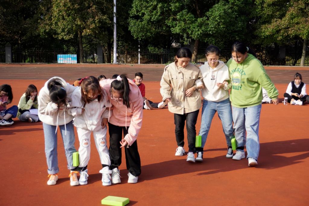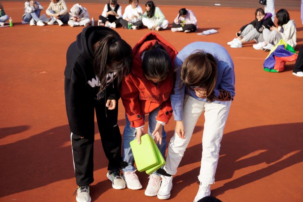 活动分为“击鼓传花”、“同舟共济”和“传呼啦圈”三个环节。在“击鼓传花”环节中,学生在操场上围坐成三圈,相互传递播放着音乐的音响,音乐停止时,手拿音响的学生则需要上台进行才艺表演。