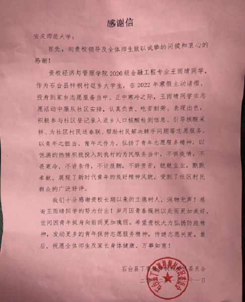 1月26日,经济与管理学院收到一封来自池州市石台县丁香镇梓桐村村民委员会的感谢信。信中介绍了2020级金融工程专业王雨晴同学主动与抗疫志愿服务的先进事迹,并对永利官网培养出“不惧疫情、不讲条件、不计报酬、不辞劳苦”的优秀大学生表示称赞。