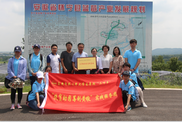 7月6日,实践团队在校团委及学院团总支相关老师的带领下赴素有“独秀故里,蓝莓之乡”之称的安徽蓝莓第一镇——黄墩镇展开调研。在黄墩镇团委书记汪雄的带领下,队员们参观了黄墩镇的蓝莓产业园、蓝莓展示馆、蓝莓深加工厂,扶贫办主任及相关负责人的详细介绍为大家把握精准扶贫的概念,了解黄墩镇以特色产业助力精准脱贫工作上了宝贵的一课。在怀宁美林蓝莓产业有限公司和安徽久越蓝莓科技发展有限公司的调研过程中,队员们详细了解了蓝莓发展模式及其扶贫措施,并运用专业背景知识,对其在电商销售方面提出了意见和建议。期间,学院还与美林蓝莓产业有限公司和安徽久越蓝莓科技发展有限公司达成校企合作事宜,并分别与两个公司共建大学生社会实践基地。