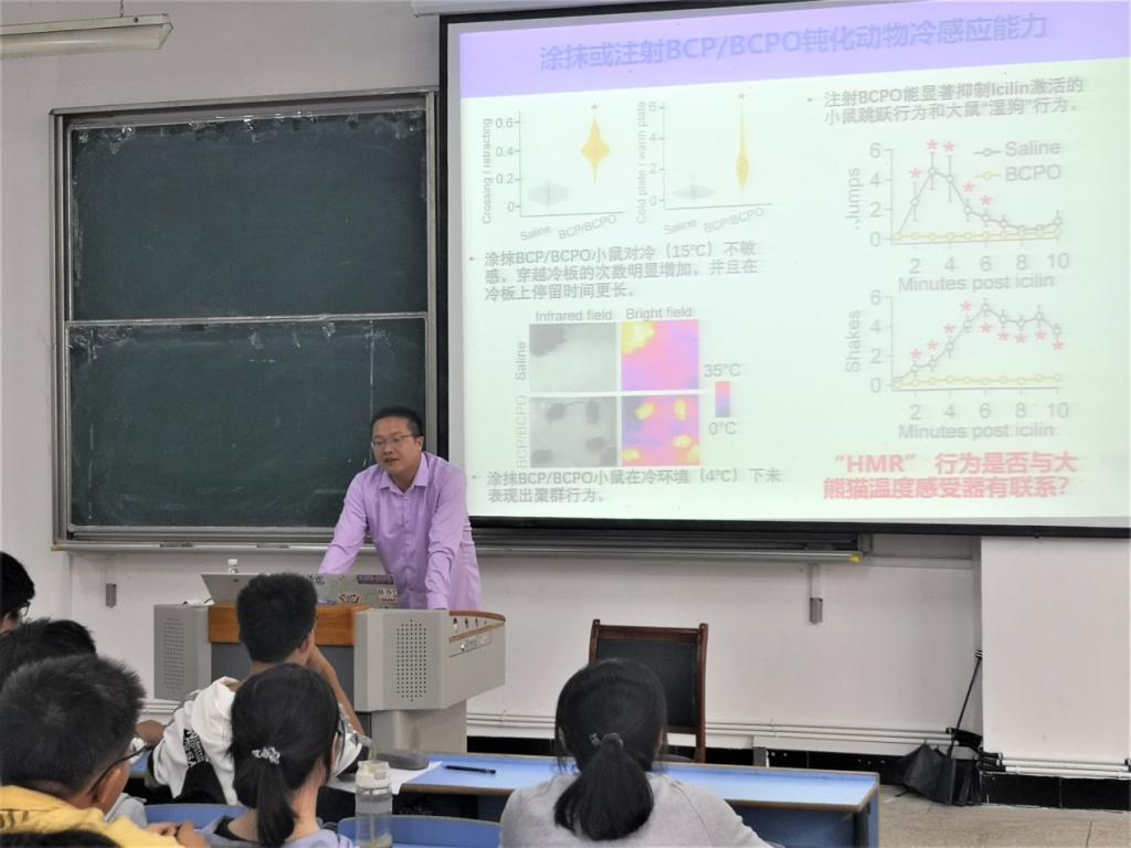 周文良在第一阶段为学生做了题为“濒危物种行为生理学研究与保护”的学术报告,报告介绍了利用红外相机、GC-MS化学分析、宏基因组、电生理及分子生物学等技术,对野生大熊猫的化学通讯、HMR行为、寄生虫感染、压力应急和产崽洞选择等行为进行的深入研究,解析其行为产生的生理-生态机制、适应性意义及历史背景等,并针对性地提出野生及圈养大熊猫种群保育和野生种群栖息地保护的有效建议。