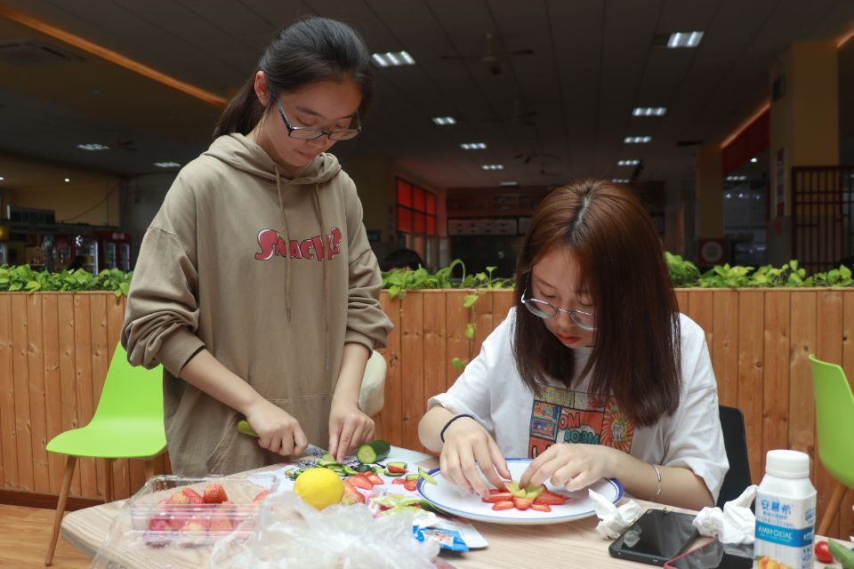 五彩缤纷的圣诞树、搞怪的小丑脸、灵动的小金鱼……参赛选手用巧手赋予草莓、香蕉、猕猴桃等水果新的生命,连食堂工作人员都前来围观。“学生们做菜做得真不错,那几个男生也做得有模有样的。”食堂阿姨吴继梅将参赛选手的做菜视频分享到自己的朋友圈。
