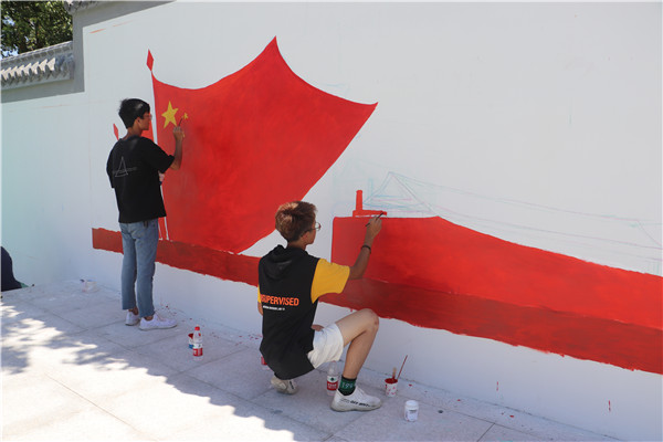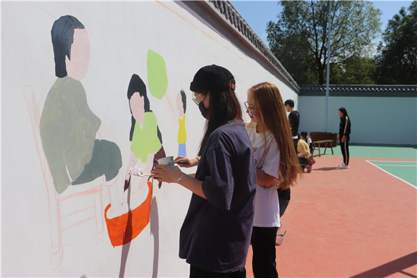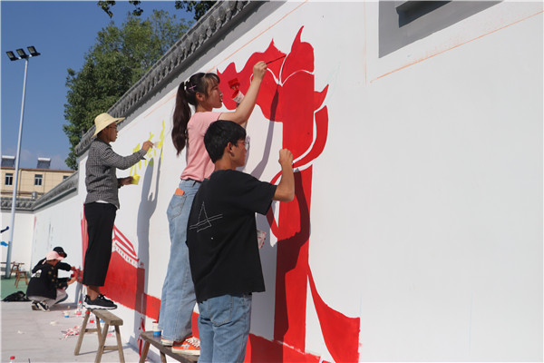 美术学专业2019(3)班的新生宋帅杰自发来到现场帮忙。“这是我第一次参加墙绘活动,有些图案绘制的不好就需要重新上色,但学长学姐们都很耐心地指导我。”他表示,虽然天气炎热,但大家在工作中互帮互助,共同努力,发出了阵阵欢声笑语,自己在这个过程中也学到了很多实践知识。