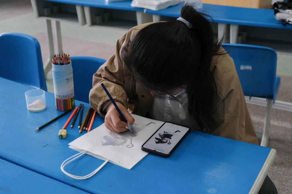 活动伊始,每位前来参与的同学按顺序领取所需用品:纸袋、彩铅、削笔刀、橡皮……一切准备就绪后,开始手绘DIY的创作。
