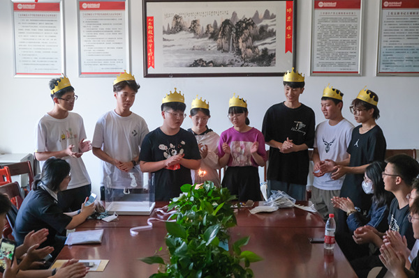 写有祝福语、摆放10位新生名牌的双层DIY 生日蛋糕一经拿出,电子信息类专业2021级(1)班的王雅琴就露出了开心的笑容,她家在浙江的她第一次离家这么远,虽然对学校充满了向往,但入学后,她还是避免不了对家人的想念。“我第一次过这样的集体生日,很有氛围感。”面对老师和同学的陪伴,感觉似乎家人就在身边,这也坚定了她要变得更加独立和坚强的信念。