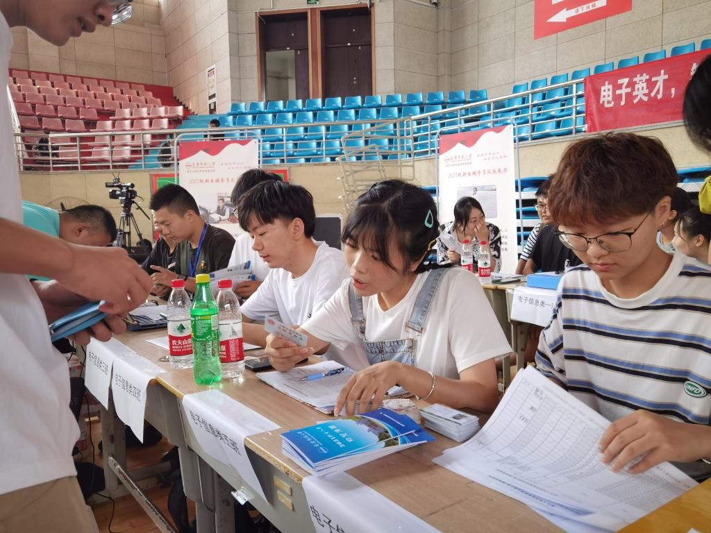 完成报到后,从体育馆东门左侧小道走出,电子信息类专业2021级(5)班的刘承迎面就看见了稼先楼前的立体签字板,以学校建筑风景作为背景,气球和白鸽点缀,“电子英才,智造未来”的渐变字样之间签写着学院新生的姓名。